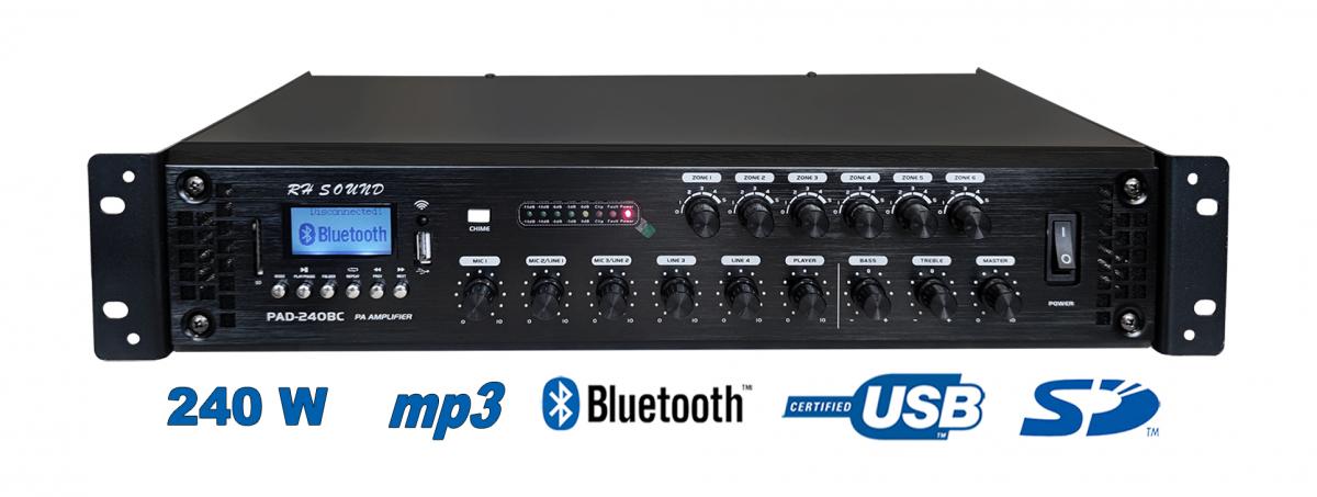 Modern digitális (D osztályú) hangosító központ telepített hangrendszerhez, beépített MP3-lejátszóval USB és SD-ről, MP3 lejátszás BLUETOOTH csatlakozással és távirányítóval.